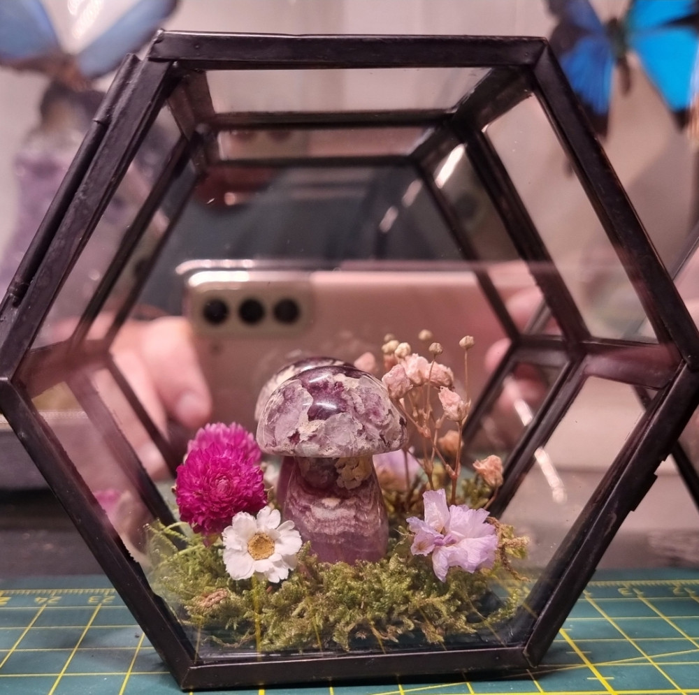 Prachtig helder glaswerk. In deze stolp zit een fluorietpaddenstoel en droogbloemen.