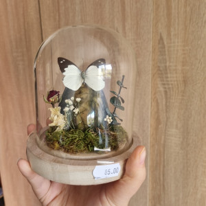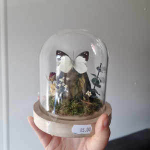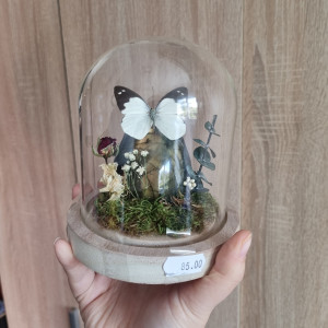 Pas op: Vlinders zijn fragiel en kunnen hun kleur verliezen als ze in de zon staan. Zet daarom de stolp niet in de volle zon.