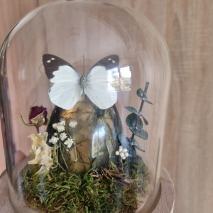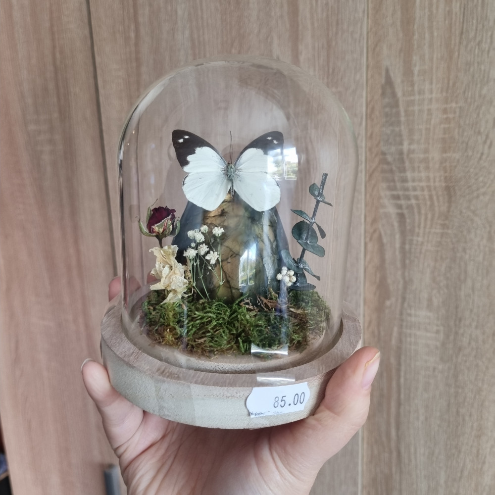 Opgezette vlinder in stolp met labradoriet en droogbloemen.